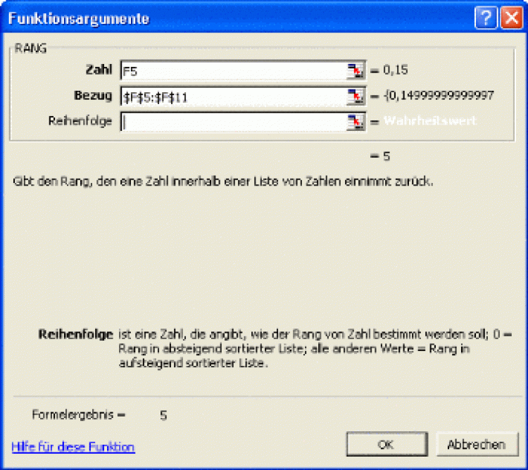 Das Dialogfenster Funktionsparameter mit den Parametern zur Funktion Rang