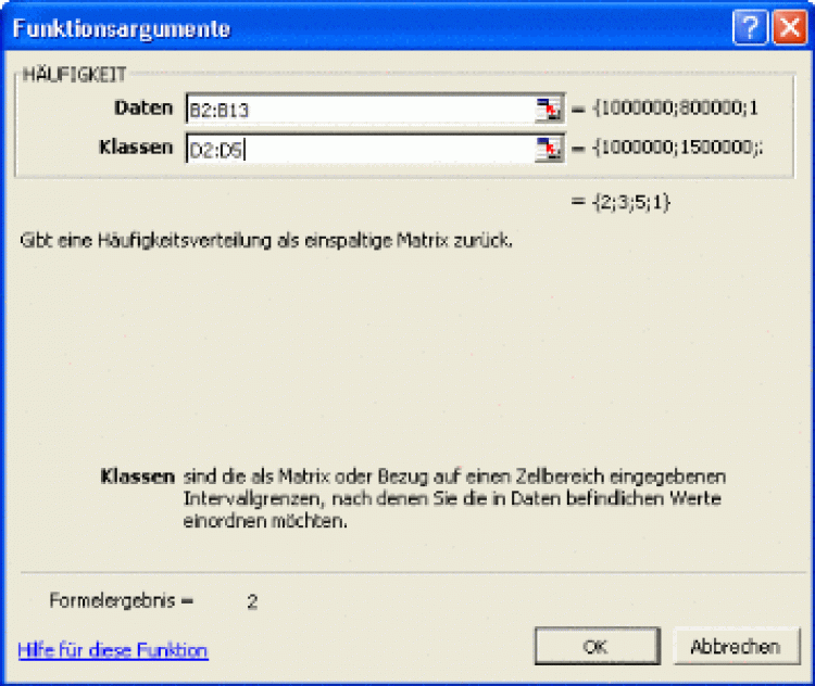 Die Funktion, mit deren Hilfe Sie Klassen-Anzahlen bilden können, heißt =häufigkeit(). Um diese Funktion einzusetzen, markieren Sie zunächst die Zellen E2 bis E5 (E5, um die Häufigkeit in der Klasse größer als 2 Millionen anzugeben). Wählen Sie nun im Einfügen-Menü den Menü-Punkt Funktion... Öffnen Sie das Listenfenster Kategorie auswählen und klicken Sie auf Statistik. Klicken Sie nun im Listenfenster Funktion auswählen die Funktion HÄUFIGKEIT und bestätigen Sie mit OK. Im Dialogfenster Funktionsargumente, Bereich Daten, geben Sie B2:B13 ein (oder markieren Sie die entsprechenden Zellen). Im Bereich Klassen geben Sie D2:D5 ein (oder markieren Sie die entsprechenden Zellen). Bestätigen Sie Ihre Eingaben mit UMSCHALT + STRG + EINGABE (Arrayfunktion).