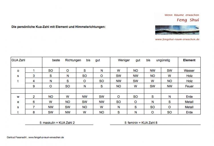Eine Frau, die am 15.03.1968 geboren wurde, hätte die Kua-Zahl 1. Ihr Element wäre Wasser und die Himmelsrichtungen Südosten und Osten. Günstig wären für Sie auch das Metall-Element und die dazugehörigen Himmelsrichtungen.