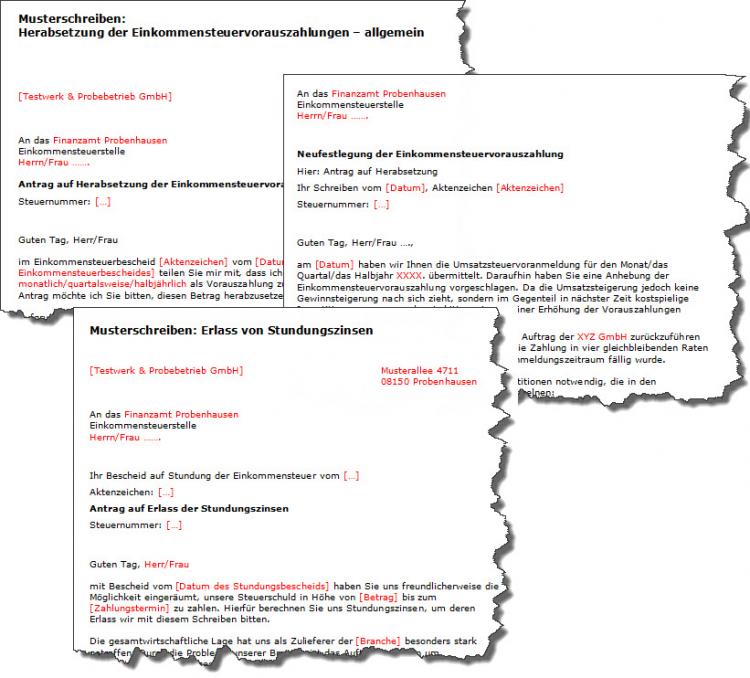 Für Mitglieder von akademie.de stehen folgende Musterbriefe zum Download bereit: Musterbriefe "Antrag auf Steuerstundung" + "Herabsetzung Einkommensteuer-Vorauszahlung" (zip, enthält 3 Musterbriefe).