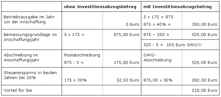 Mithilfe der Investitionsabzugsbeträge können Sie bei Wirtschaftsgütern bis zu einem Anschaffungswert von 250 Euro zwei Fliegen mit einer Klappe schlagen. Zum einen tragen die Beträge zu Gewinnminderung und damit zur Senkung der Vorauszahlungen bei. Zum anderen können Sie damit auch die Poolbildung bei der Abschreibung (über 5 Jahre!) verhindern und die angeschafften Güter komplett abschreiben.