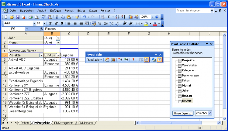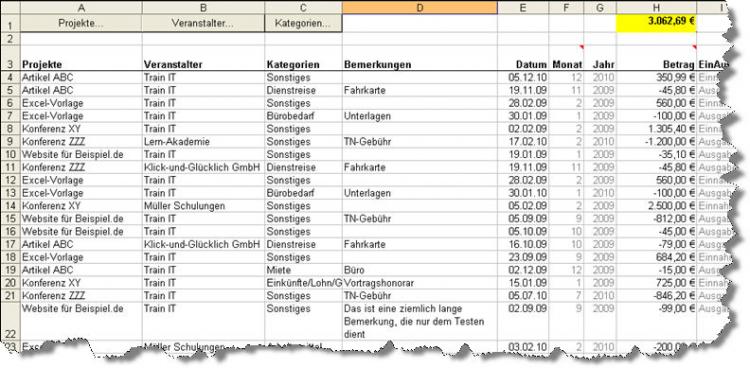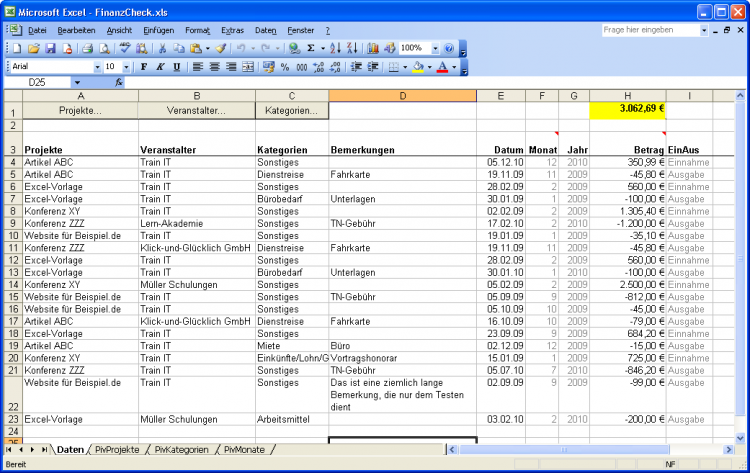 FinanzCheck basiert auf Excel. Das erste Tabellenblatt besteht aus einer Liste, in die Sie alle Einnahmen und Ausgaben in beliebiger Reihenfolge eintragen und einem beliebigen Posten, Projekt o. ä. zuordnen.