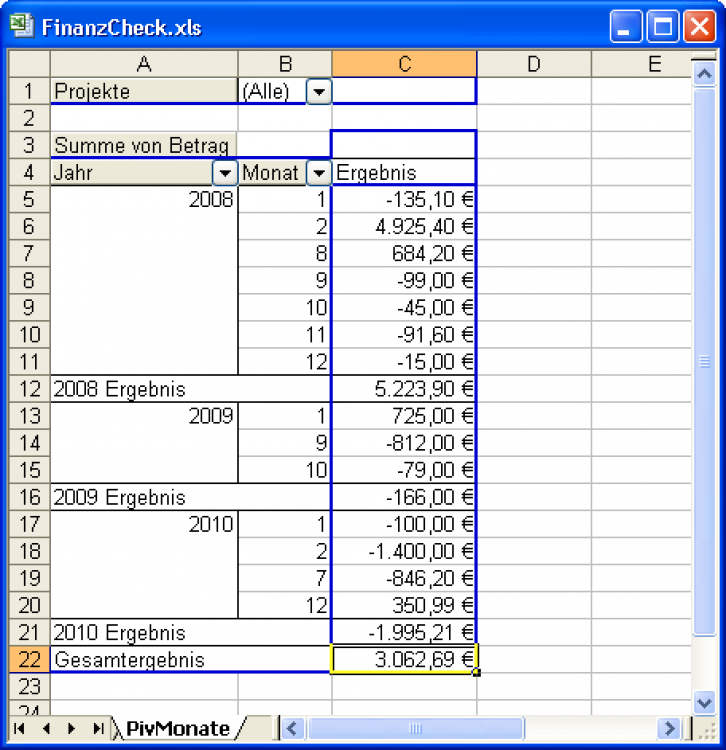 Auf vorbereiteten Tabellenblättern können Sie aktuelle Auswertungen Ihrer Daten sehen. Im folgenden Bild sehen Sie beispielsweise die Umsätze nach Projekten einschließlich des Gesamtumsatzes: