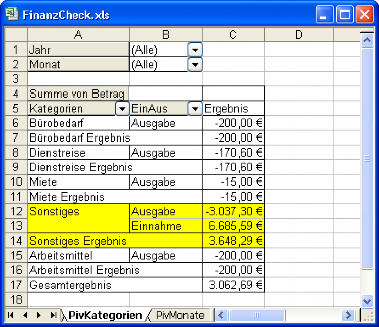 Um einzelne Kategorien zu betrachten, gibt es eine weitere Auswertungsmöglichkeit. Sie sehen dort automatisch Einnahmen und Ausgaben sowie deren Gesamtsumme, wie es im folgenden Bild für die Kategorie "Sonstiges" gelb markiert ist. Auch die Kategorien lassen sich nach Jahr und Monat filtern.