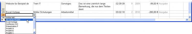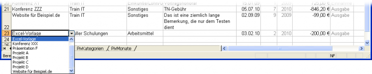 Zu den wesentlichen Spalten (Projekte, Veranstalter, Kategorien) gibt es in jeder Zelle eine Ausklappliste wie im folgenden Bild: