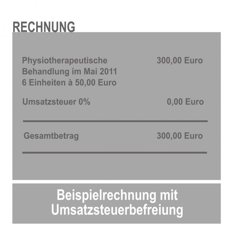 Die Gesetzgebung hat im Umsatzsteuerrecht eine ganze Reihe Ausnahmen geschaffen. Informieren Sie sich frühzeitig, ob Ihr Geschäftsfeld zu diesen Ausnahmen gehört. Zu den am weitesten verbreiteten Ausnahmen gehören beispielsweise die meisten Gesundheitsberufe. Wer sich also als Physiotherapeut selbstständig macht, stellt den zukünftigen Kunden keine Umsatzsteuer in Rechnung - so wie in der vorherigen Abbildung. Die "ganz normale" Rechnung dagegen stellt sich vereinfacht dar, wie im Bild rechts - mit Umsatzsteuer.