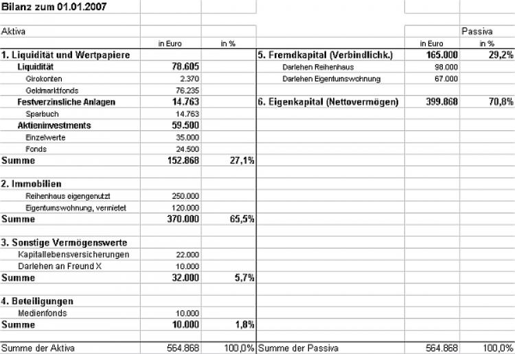 Nachdem Sie alle Daten zusammengestellt haben, können Sie Ihre Vermögenswerte in einer Bilanz analog einer Unternehmensbilanz zusammenstellen. Auf der linken Seite ordnen Sie Ihr Vermögen nach seiner Verwendung in die Unterpunkte: