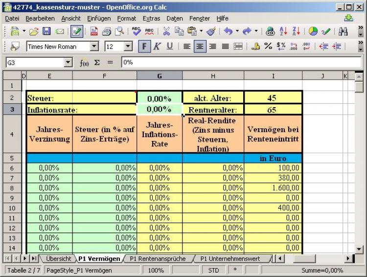 Um hier Anpassungen vorzunehmen, müssen Sie bei jeder Einzelposition bestehende oder anzunehmende Werte (Zinsen, Steuern, Inflation) eintragen. In den Dateivorlagen sind diese Felder bis auf eines sämtlich unberührt: Nur in den Formularen P1 bzw. P2 Rentenansprüche ist bei der gesetzlichen Rente bei der Verzinsung der Schrumpfzinssatz von 1 % pro Jahr eingetragen. Das berücksichtigt die Tatsache, dass die gelegentlichen Rentenerhöhungen die Inflation nicht einholen und der tatsächliche Rentenanspruch jedes Jahr immer weiter absinkt.