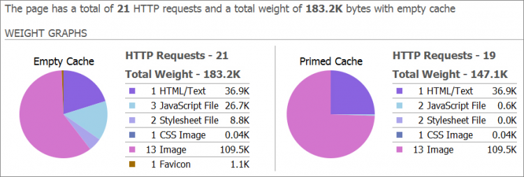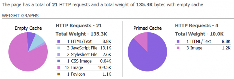 In der ersten Abbildung sehen Sie die Werte vor der Optimierung. In der linken Hälfte des Bildes sehen Sie die Werte beim Erstbesuch und rechts die Werte beim erneuten Besuch (gefüllter Browser-Cache).