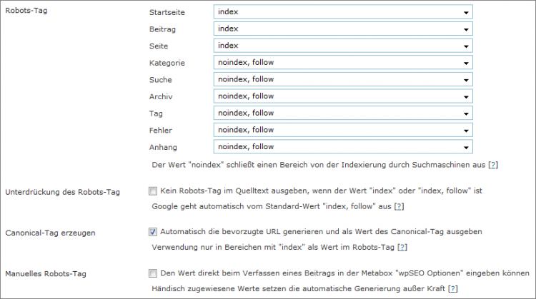 Bei wpSEO kann man recht einfach auswählen, welche Unterseiten indiziert werden sollen und ob den Links auf diesen Unterseiten gefolgt werden soll. Neben den Indizierungsanweisungen für die Suchmaschinen kann wpSEO auch das neue Canonical-"Tag" erzeugen. Ich habe das Wort Tag extra in Anführungszeichen gesetzt, weil es sich hierbei nicht um einen neuen Tag, sondern um einen neuen Attribut-Wert handelt: