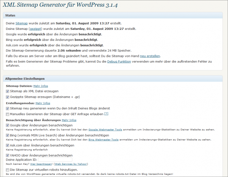 Mittlerweile hat das Plugin XML Sitemap Generator für WordPress nicht nur eine Benachrichtigungsfunktion für Google, sondern auch für Yahoo, Ask.com und Bing, die auch auf die Sitemap-Datei zugreifen.