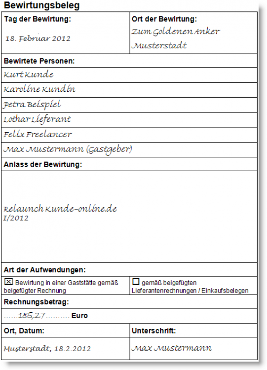 möglichst konkreter Anlass der Bewirtung (also nicht einfach "Informationsgespräch" oder "Projektbesprechung", sondern z. B. "Relaunchplanung mustermann-online.de 2012") sowie