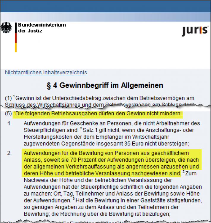 Das erkennen sogar die Finanzbehörden an: § 4 Abs. 5 Einkommensteuergesetz sowie die R 4.10 der Einkommensteuer-Richtlinien enthalten - wenn auch in negativ formulierter Form - recht genaue Angaben über die Abzugsfähigkeit der "Bewirtung von Personen aus geschäftlichem Anlass". Unter "Bewirtung" versteht das Steuerrecht grundsätzlich den "Verzehr von Speisen, Getränken und sonstigen Genussmitteln".