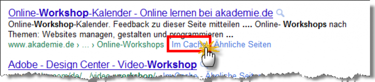 Unter den allermeisten Suchmaschinentreffer findet sich der Link "Im Cache": Über den können Besucher sich eine Internetseite auch dann noch anzeigen lassen, wenn die Originalseite nicht mehr verfügbar oder der Server vorübergehend nicht erreichbar ist.