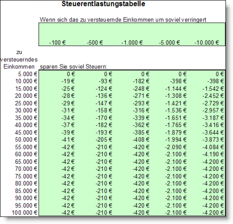 Steuerentlastungen durch Verringerung des zu versteuernden Einkommens. Berechnungsbasis ist die Einkommensteuer-"Grundtabelle" für Unverheiratete. (Quelle: Wikipedia.de)