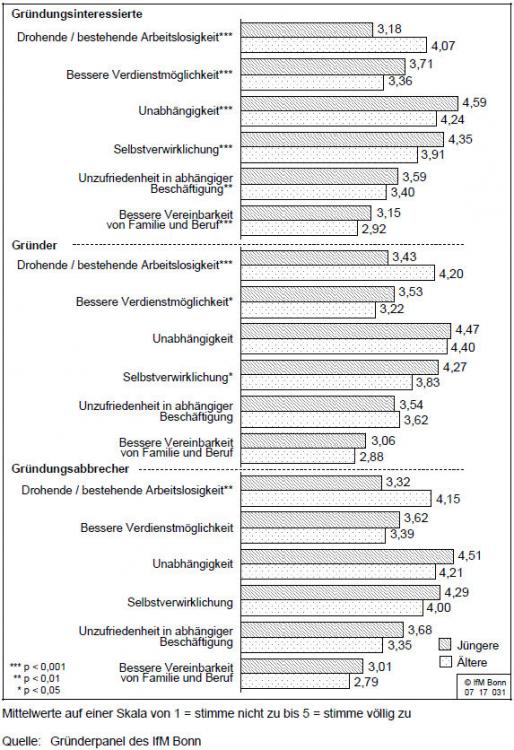 Die Chancen auf dem Arbeitsmarkt sind mitunter schlecht - besonders dann, wenn Sie eine der geforderten Qualifikation und Erfahrung entsprechende Bezahlung erwarten. Die Gründung eines eigenen Unternehmens ist manchmal die einzige Chance auf eine neue Perspektive und ein möglicher Weg aus der Arbeitslosigkeit. Gerade bei älteren Gründern spielen diese Motive eine vergleichsweise große Rolle, wie die folgende Grafik (die dem Gründerpanel des IfM Bonn entnommen ist) zeigt.