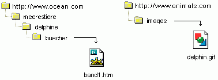 Ein absoluter Pfadname mit URL-Angabe beginnt immer mit dem verwendeten Protokoll (z.B. http://) , dann wird der Rechner genannt (z.B. www.ocean.com), danach folgt der Pfad (z.B. images/delphine) und zum Schluss der Dateiname (z.B. delphin.gif).
