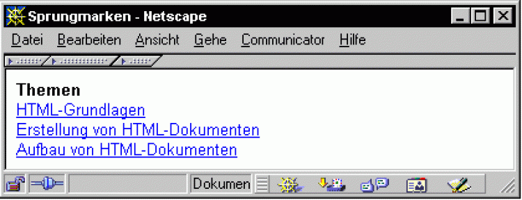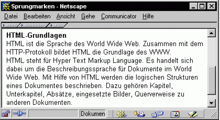 Wenn Sie auf den Link "HTML-Grundlagen" klicken, springen Sie zur Überschrift "HTML-Grundlagen". Probieren Sie es am Link "HTML-Grundlagen" einfach aus. Ein Blick in den Browser: