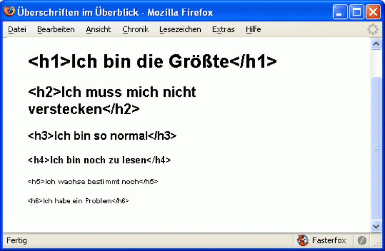 Damit Sie Überschriften unterschiedlicher Größe in Ihrem Dokument verwenden können, bietet HTML sechs Überschriftenebenen von <h1> ... </h1> bis <h6> ... </h6>. Mit ihrer Hilfe können Sie Ihr Dokument übersichtlich aufbauen und gliedern.