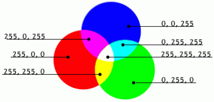 "Beim RGB-Modell wird eine Farbe durch ihre Anteile an den drei Grundfarben Rot, Grün und Blau definiert. Jede Farbe hat also einen Rotwert, einen Grünwert und einen Blauwert. Jeder der drei Werte wird durch Zahlen zwischen 0 und 255 definiert. Der Wert 0 bedeutet: keinen Anteil an der betreffenden Grundfarbe, der Wert 255 bedeutet: maximalen Anteil an der betreffenden Grundfarbe. Ein dunkles Blau z.B. hat nach diesem Schema die Farbwerte 0,0,153 (0 rot, 0 grün, 153 blau). Mit diesem Schema können bis zu 16,7 Mio. unterschiedliche Farben definiert werden." (aus: SELFHTML)