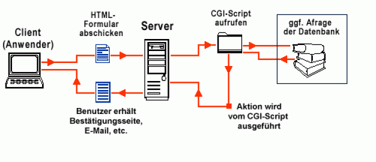 Das Schaubild zeigt Ihnen, wie der Datenfluß bei der Verarbeitung von CGI-Scripts verläuft. Wie Sie sehen, läßt sich zusätzlich eine Datenbankabfrage per CGI-Script in die Verarbeitung der Daten integrieren.