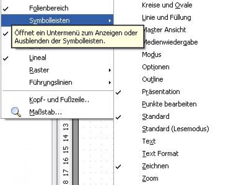 Die Symbolleisten können Sie an der Titelleiste in die gewünschte Bildschirmposition ziehen. Sie können sie auch beliebig konfigurieren und sich damit eine eigene Arbeitsumgebung schaffen. Dazu klicken Sie "Ansicht" - "Symbolleisten" - "Zeichnen" an.