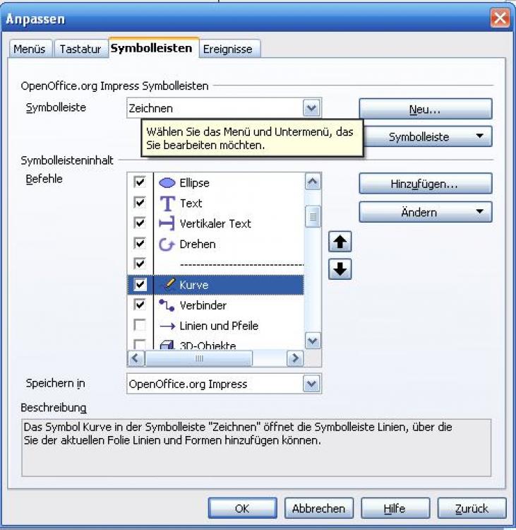 Wählen Sie im Feld Symbolleisten die betreffende Symbolleiste aus und klicken Sie das gewünschte Symbol an, damit es sichtbar wird. Das Symbol kann mit den Pfeiltasten-Buttons nach "oben" oder "unten" in seiner Position auf der Symbolleiste verschoben werden.
