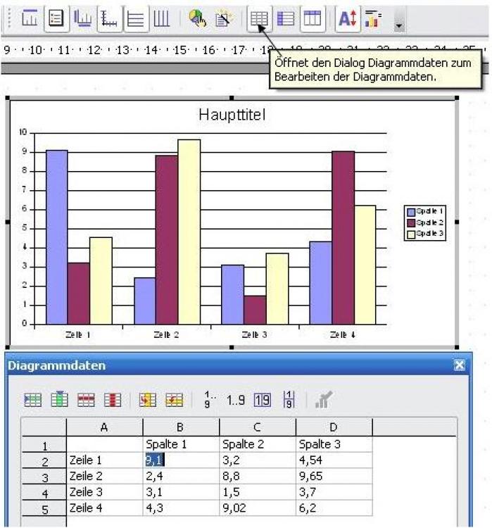 Sollte die Tabelle für die Diagrammdaten nicht angezeigt werden, klicken Sie gemäß obigem Bild auf das gezeigte Symbol oder mit der rechten Maustaste auf das Beispieldiagramm und wählen Sie im Kontextmenü "Diagrammdaten". Damit können Sie die Sichtbarkeit der Tabelle für die Quelldaten des Diagramms ein- bzw. ausschalten.