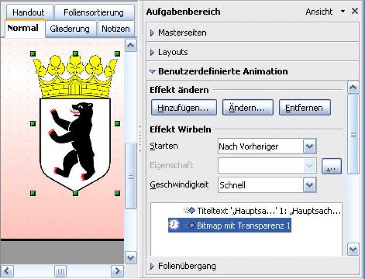 1. Klicken Sie in der Präsentation Effekte.odp auf das Wappen und wählen Sie zunächst Einfliegen schnell nach Vorheriger nach 1 Sekunde.