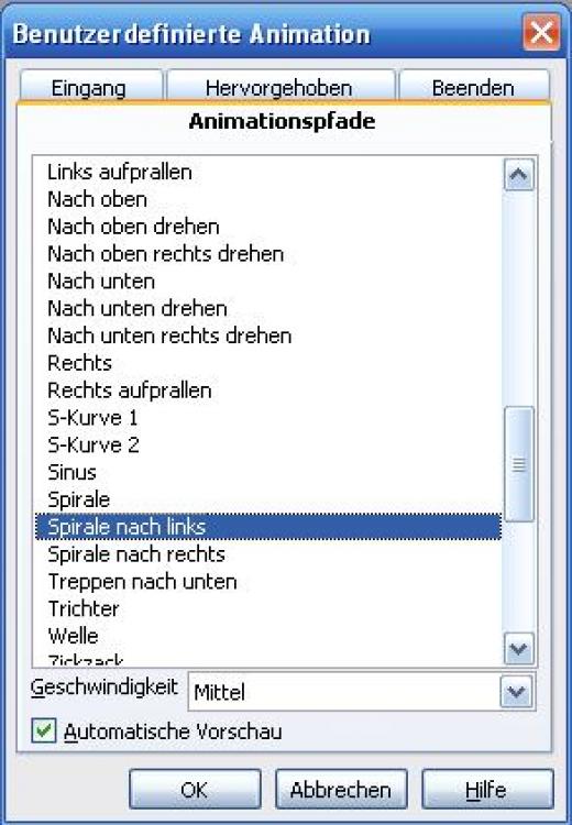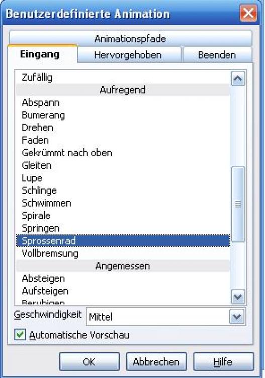 In der Gruppe Eingang sind alle Effekte zum Erscheinen eines Textfeldes oder einer Grafik aufgeführt.