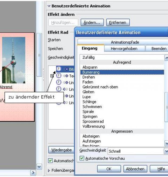 Die bereits zugeordneten Effekte können Sie auch nachträglich ändern. Klicken Sie dazu in der Liste der Effekte auf den betreffenden Effekt oder das betreffende Objekt und wählen Sie Ändern. Sie erhalten wieder die Ihnen schon bekannte Auswahl eines Effekts. Über Entfernen löschen Sie den ausgewählten Effekt.