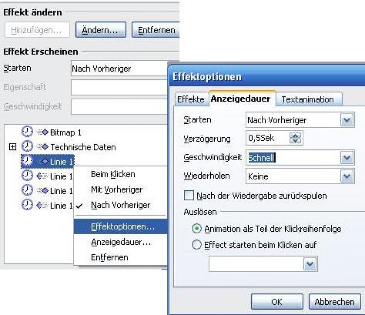 Wählen Sie anschließend mit der linken Maustaste die Effektoptionen. Klicken Sie auf das Register Anzeigedauer und dann im Feld Starten auf Nach vorheriger. Wählen Sie noch eine Zeitdauer aus Verzögerung und eine Geschwindigkeit aus.