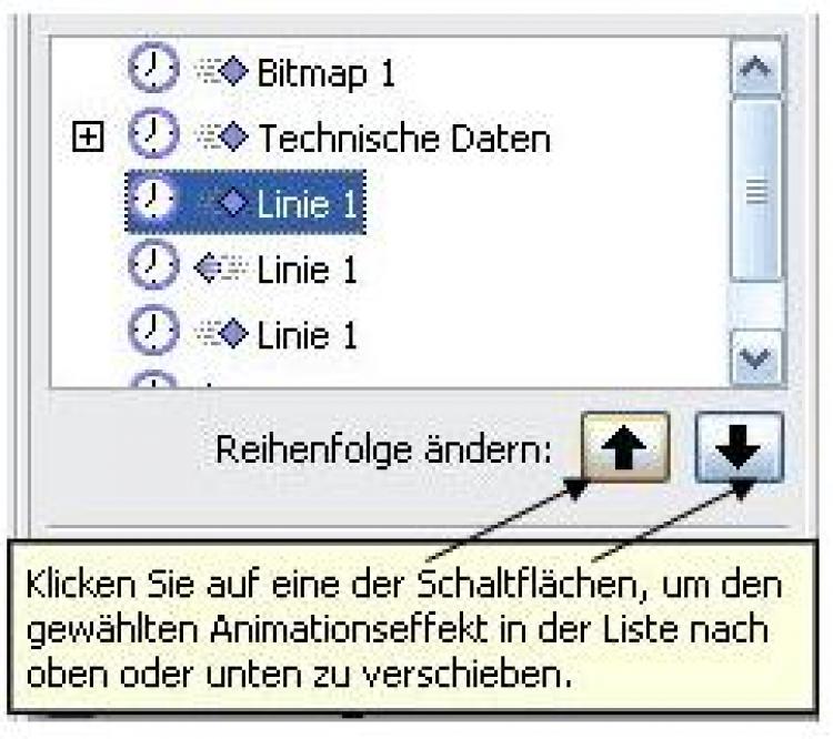 Sie können auch die Reihenfolge der Effekte verändern: Klicken Sie auf den betreffenden Effekt in der Liste und verschieben Sie ihn mittels der Pfeile im Bereich "Reihenfolge ändern" nach oben oder unten.