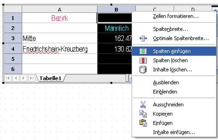 2. Fügen Sie, wie Sie es von OpenOffice.org Calc gewöhnt sind, vor Spalte B eine weitere Spalte ein.