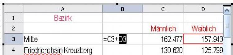 Wie in OpenOffice.org Calc können Sie Formeln eingeben, mit <return> abschließen und.....