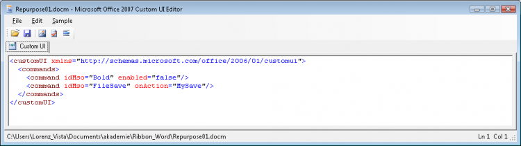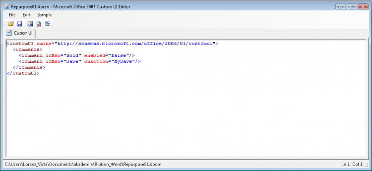 Erstellen Sie zum Testen eine neue leere Word-Datei im Format "Word-Dokument mit Makros" (*.docm) oder "Word-Vorlage mit Makros" (*.dotm). Öffnen Sie diese dann im Custom UI Editor und fügen Sie mit dem Menü Sample/Repurpose den folgenden Code ein: