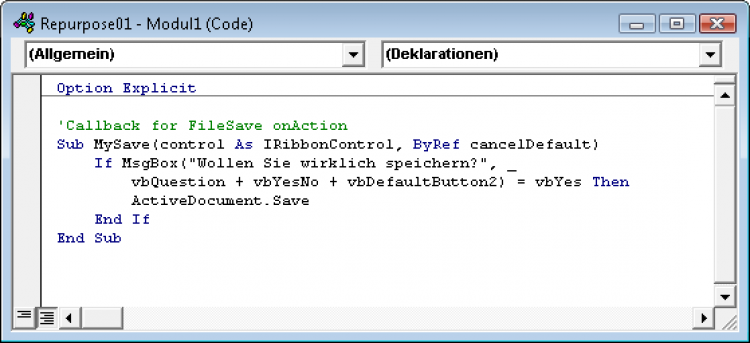 Anschließend müssen Sie in Word mit dem VBA-Editor noch die im onAction-Attribut aufgerufene Prozedur MySave erstellen: