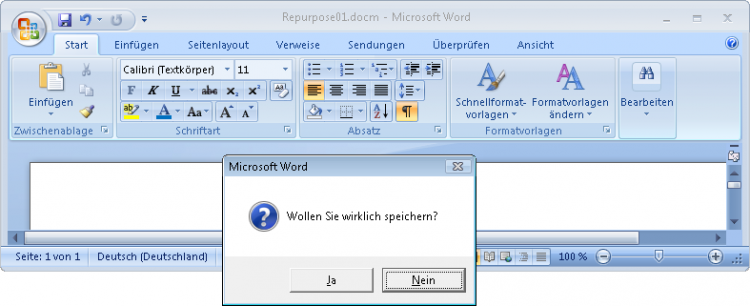 Sobald ein Benutzer auf die (oben in der Schnellstartleiste gelegene) Word-interne Speichern-Schaltfläche klickt, wird nun offensichtlich Ihre eigene Prozedur ausgeführt: