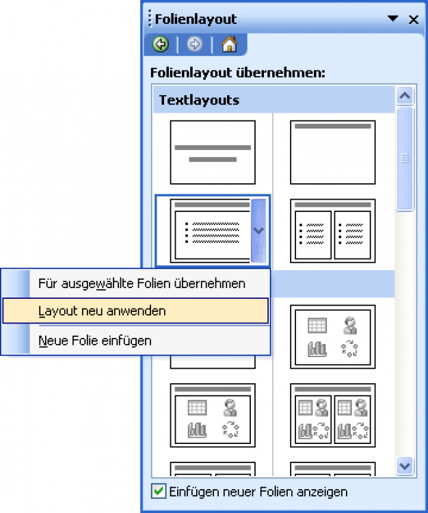 Dort findet sich im DropDown-Pfeil der Befehl Layout neu anwenden: