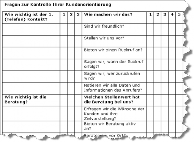 Zuerst wird immer die Hauptfrage, also "Wie wichtig ist der 1. (Telefon-)Kontakt?" bewertet. Anschließend werden die Teilfragen "Wie machen wir das?" nach dem Schulnotensystem beantwortet. Wenn Sie so vorgehen und sämtliche Fragen beantwortet haben, erkennen Sie und Ihre Mitarbeiter, wie gut bzw. wie schlecht Ihre Kundenorientierung ist. Gleichzeitig ist der ausgefüllte Fragebogen eine konkrete Handlungsanleitung. Aufgrund der Bewertungen wissen Sie, in welchen "sehr wichtigen" Bereichen Sie kurzfristig tätig werden müssen.