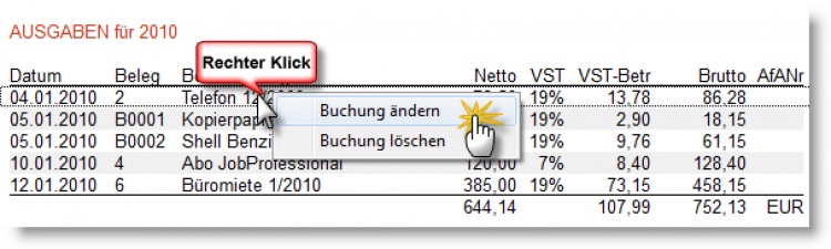 Wer je mit "richtigen" Buchhaltungsprogrammen gearbeitet hat, die entsprechend der Vorschriften für die doppelte Buchführung gegen nachträgliche Änderungen geschützt sind, wird die komfortable Editierfunktion für vorgenommene Buchungen zu schätzen wissen: Ein Rechtsklick auf einen Eintrag genügt und Sie können wählen, ob Sie die betreffende Buchung ändern oder löschen wollen.