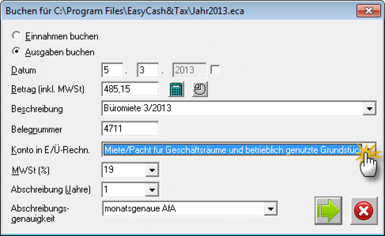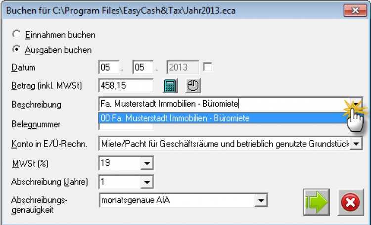 Künftig brauchen Sie beim Buchen nur das Datum und den Betrag einzugeben und im Feld "Beschreibung" auf den Drop-Down-Pfeil zu klicken und den Miet-Eintrag auszuwählen, um diese Voreinstellungen zu übernehmen. Selbstverständlich sind in jedem Einzelfall noch manuelle Ergänzungen möglich.