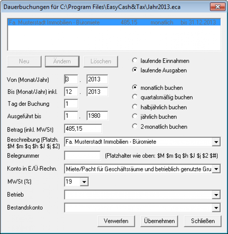 Zusätzlich oder alternativ zu solchen Buchungs-Vorlagen können Sie Dauerbuchungen für regelmäßige, in gleicher Höhe wiederkehrende Vorgänge definieren (über das linke Kalender-Symbol: "Dauerbuchungen eingeben").