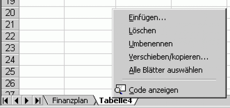 Das Anklicken eines Registers mit der rechten Maustaste (= Kontextmenü) ermöglicht u.a. das Umbenennen, Hinzufügen, Verlagern / Kopieren (auch in andere Mappen) oder Löschen von Blättern sowie das Aufheben einer Gruppierung.