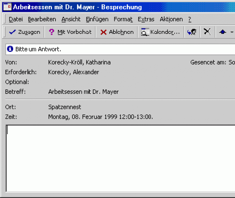 Wurde eine Besprechungsanfrage ausgesendet, kann der Empfänger nach dem Öffnen der Nachricht auf verschiedene Arten reagieren. Dazu stehen in der Symbolleiste der Nachricht Schaltflächen zum "Zusagen", "Mit Vorbehalt zusagen", "Ablehnen" und zum Anzeigen vom "Kalender..." zur Verfügung. Außerdem besteht die Möglichkeit, einer Absage einen bestimmten Text hinzuzufügen, um z.B. alternative Termine vorzuschlagen.