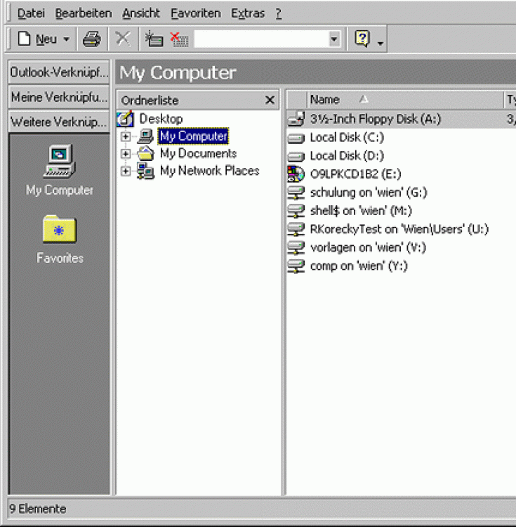 In der Outlook-Gruppe "Weitere Verknüpfungen" befindet sich ein Symbol zur Verwaltung von Laufwerken, Ordnern und Dokumenten: "Arbeitsplatz". Wird dieses Symbol angeklickt, werden im rechten Bereich des Bildschirmes die vorhandenen Laufwerke des PC angezeigt. Diese können wiederum durch einen Doppelklick geöffnet werden und zeigen daraufhin ihren Inhalt.