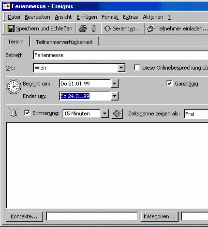 Die Besonderheit von Ereignissen ist, daß es sich um ganztägige Termine handelt, bei denen die Zeitspanne meist als "Frei" angezeigt wird.