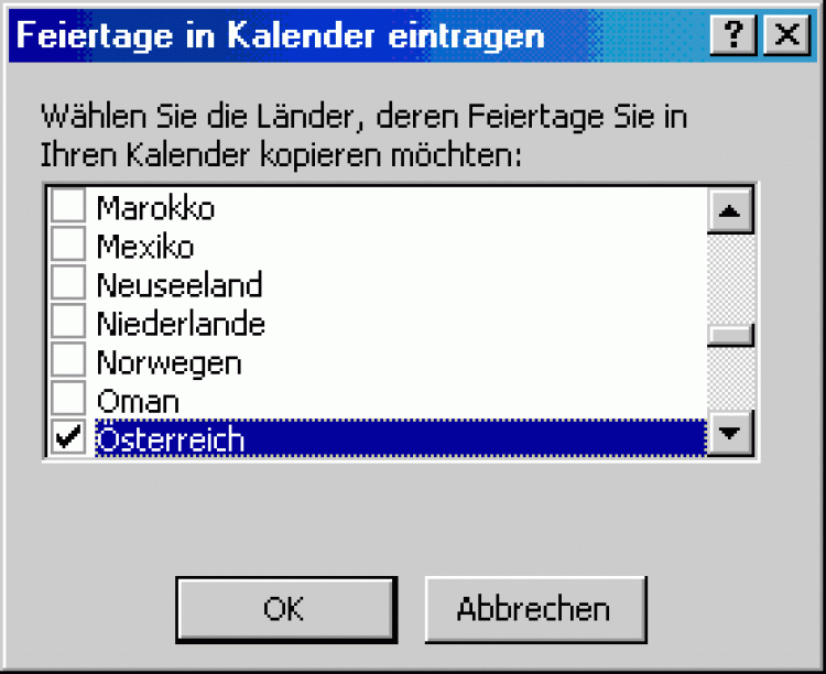 Dazu ist aus dem Menü "Extras - Optionen..." zu wählen. Im Register "Einstellungen" gelangt man über die Schaltflächen "Kalenderoptionen..." und dann "Feiertage hinzufügen..." in das Dialogfeld "Feiertage in Kalender eintragen".