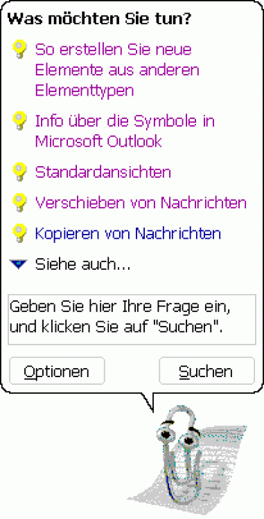 Microsoft Outlook enthält den sogenannten Office-Assistenten. Dieser wird - falls nicht ohnehin bereits sichtbar - mit der gleichnamigen Schaltfläche aus der Standard-Symbolleiste oder mit F1 aufgerufen. Der Office-Assistent bietet Tips an bzw. ermöglicht - nach dem Anklicken an beliebiger Stelle - die Eingabe von Fragen in freier, eigener Formulierung. Nach einem Klick auf die Schaltfläche "Suchen" erscheint eine Liste der gefundenen Themen - nach dem Anklicken eines Themas erscheint die gewünschte Hilfeseite.