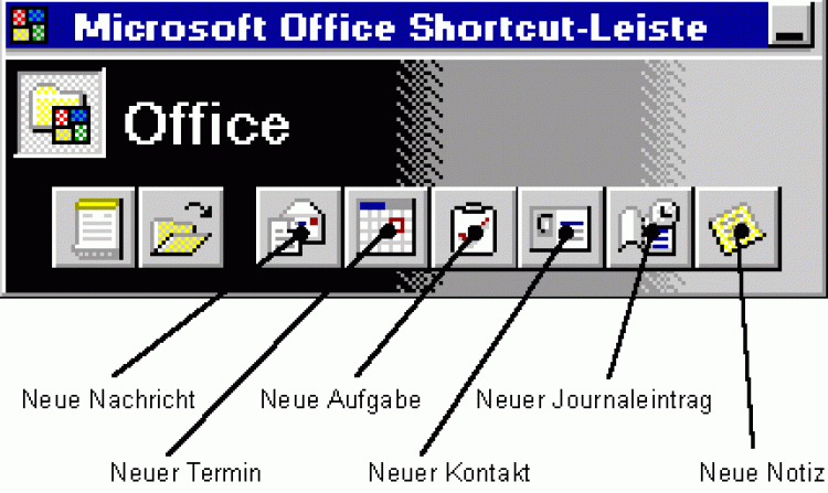 • Wenn Microsoft Office und die Microsoft Office Shortcut-Leiste installiert sind, können neue Outlook-Elemente auch mit den Symbolen Neue Nachricht, Neuer Termin, Neue Aufgabe, etc. erstellt werden, egal ob Outlook gestartet ist oder nicht.
